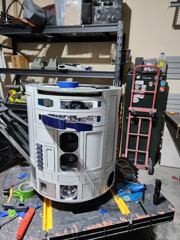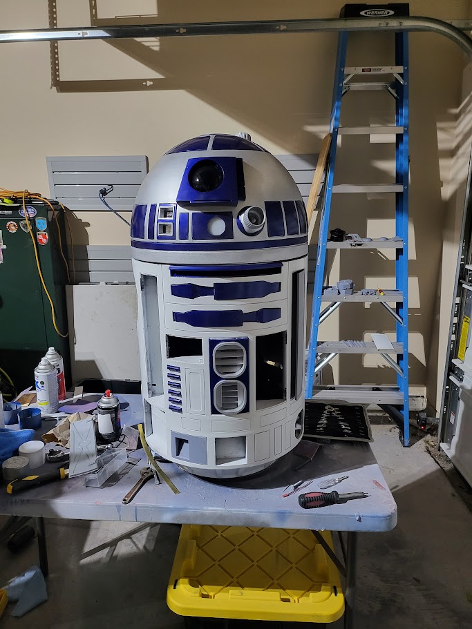 After trooping with my 3D R2-D2, I decided I wanted to GO BIG. I jumped in and started an aluminum build. Because these are so expensive and aluminum parts are not necessarily easy to procure in a timely fashion, he has been a 2 year project. It acturally started off as a hybrid wood frame/aluminum body build, but scraped that and decided to go full aluminum. When you see the photos you will see where it started as wood and converted somewhere down the line. My intent is to mainly troop with my aluminum R2-D2 and convert my 3D R2-D2 into R4-D2 (bad motiviator droid). As of 8/18/2025 the aluminum R2-D2 is fully built; however the electronics need some fine tuning before he is ready for the public service.